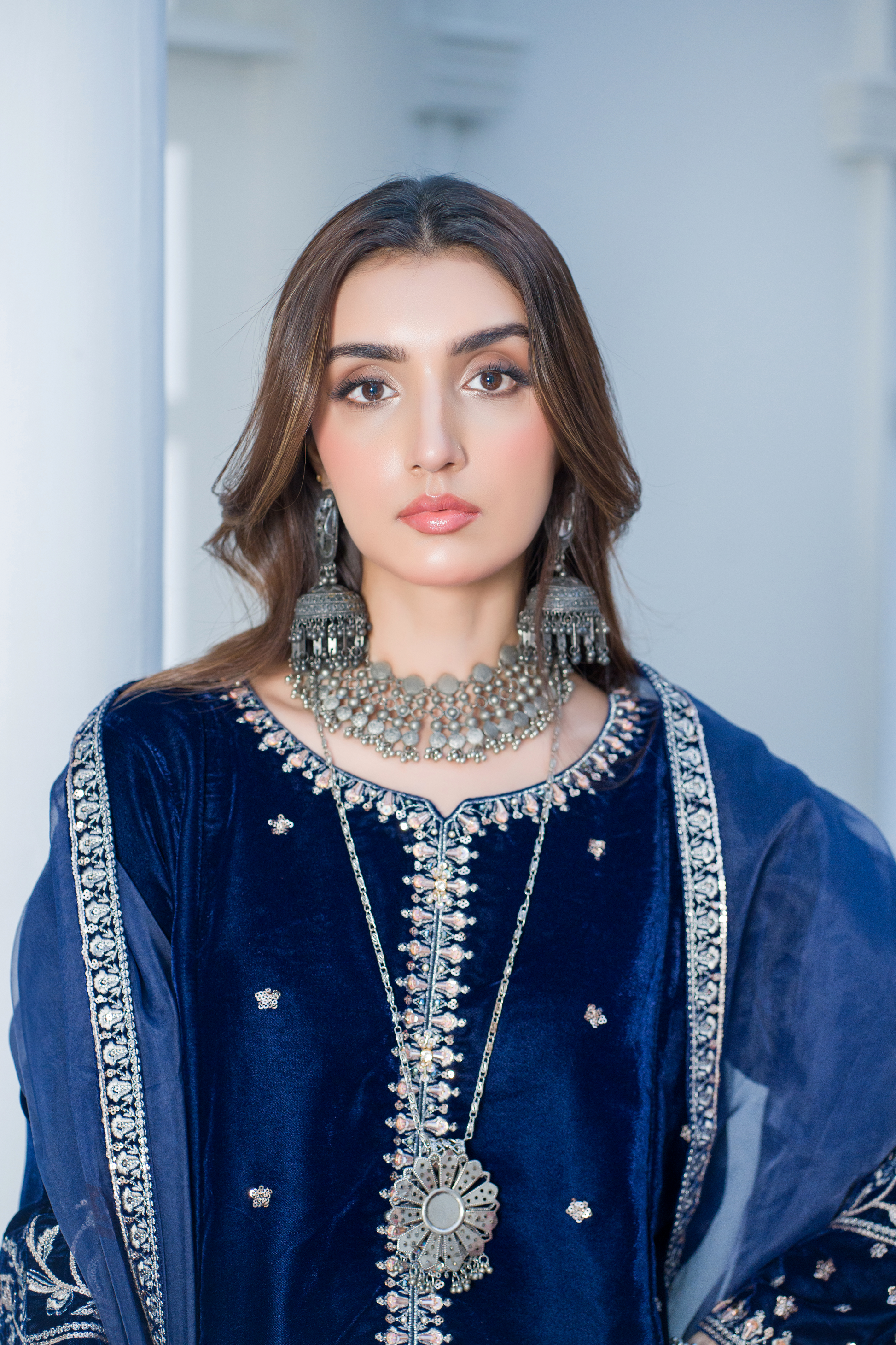 This luxurious embroidered velvet ensemble blends rich textures with delicate craftsmanship.