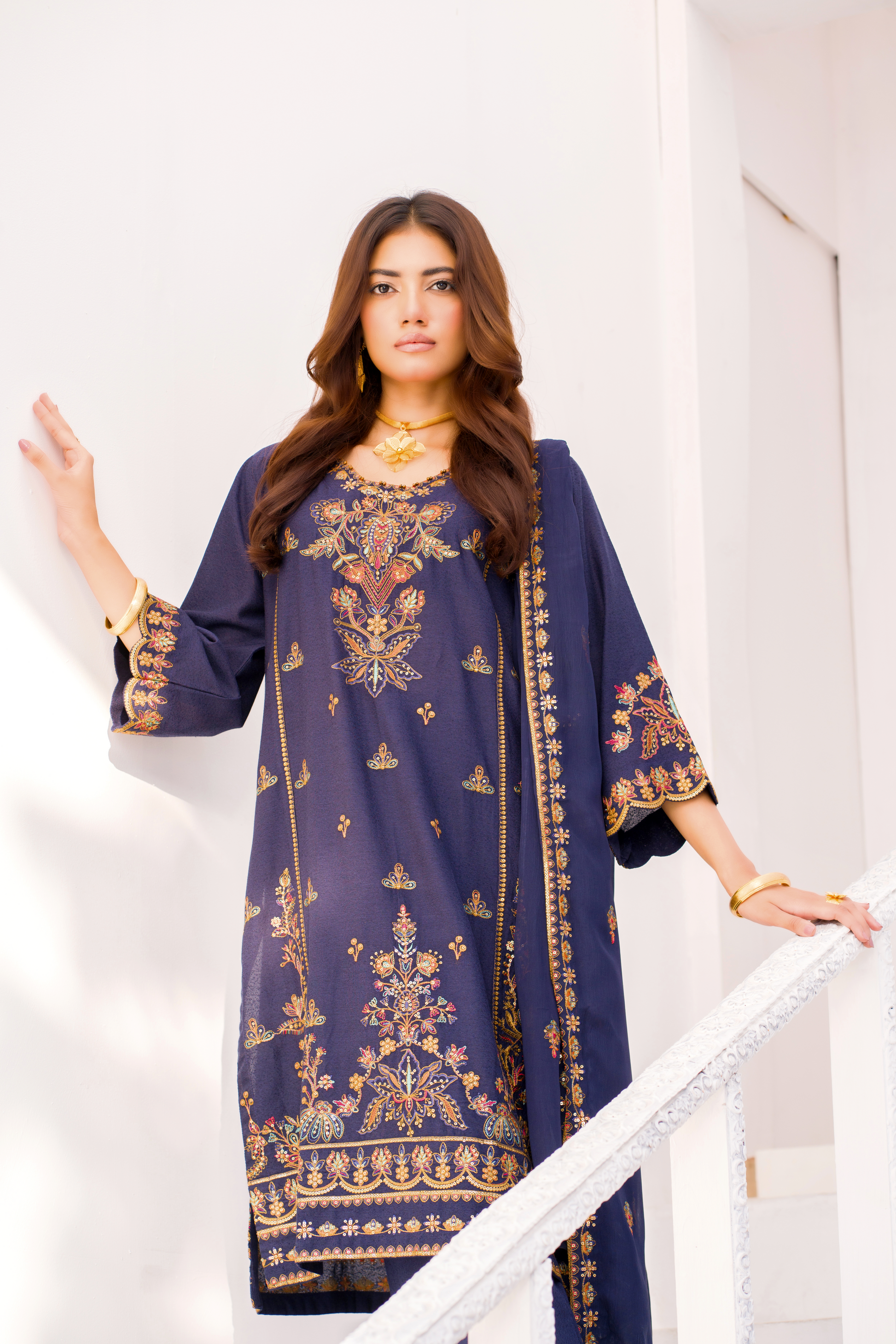 Capture deep, sophisticated traditional style with this stunning navy-blue embroidered suit. The
