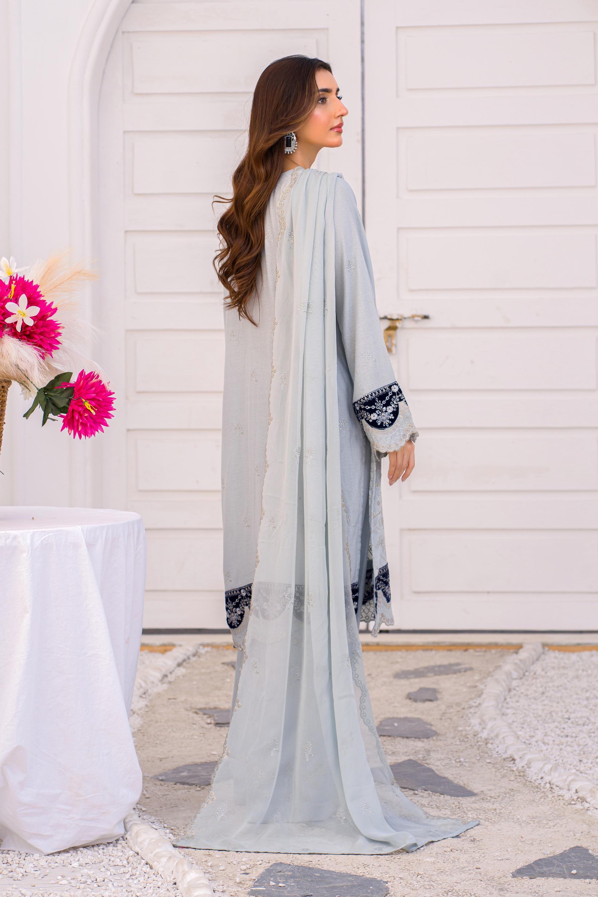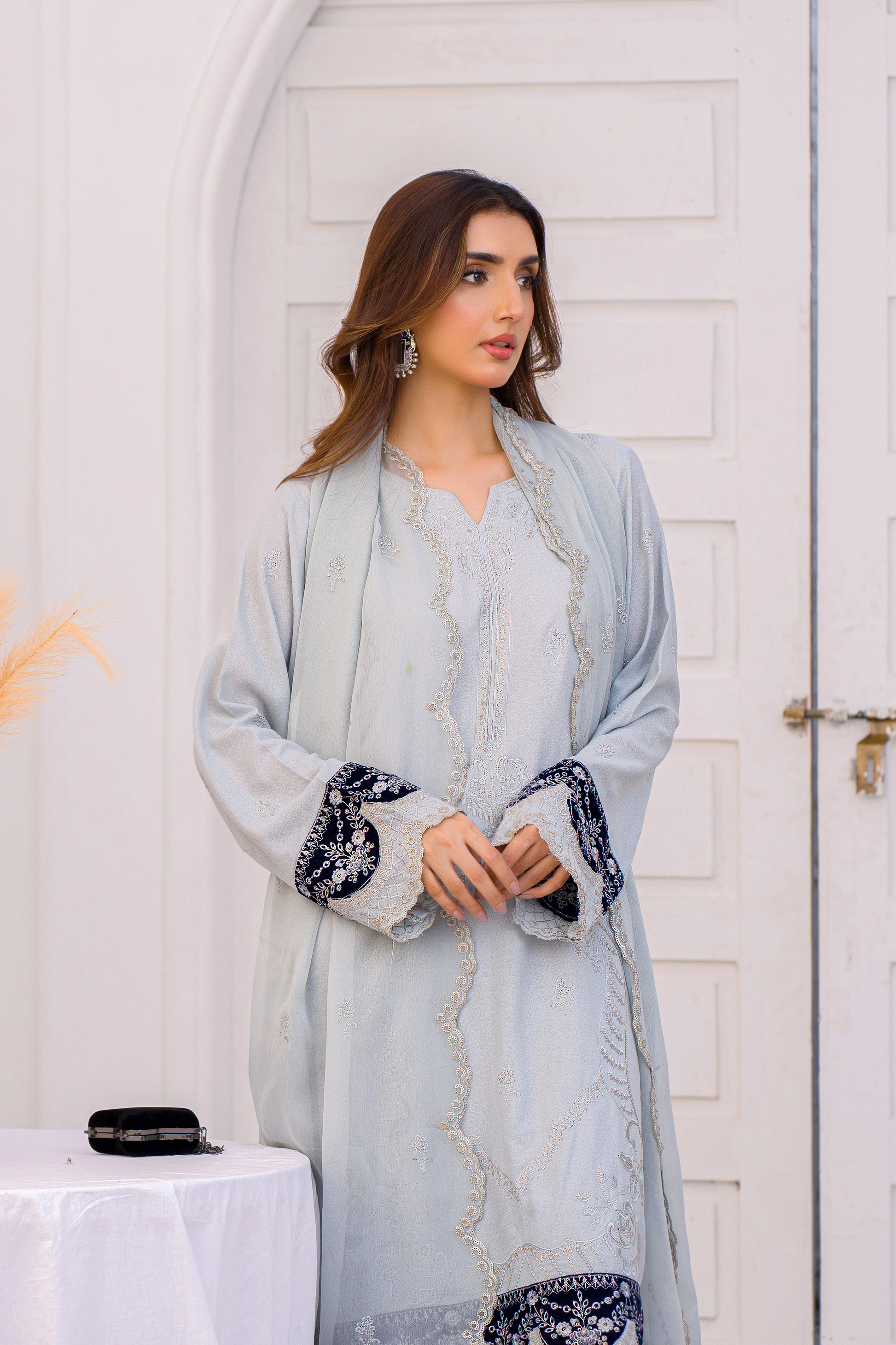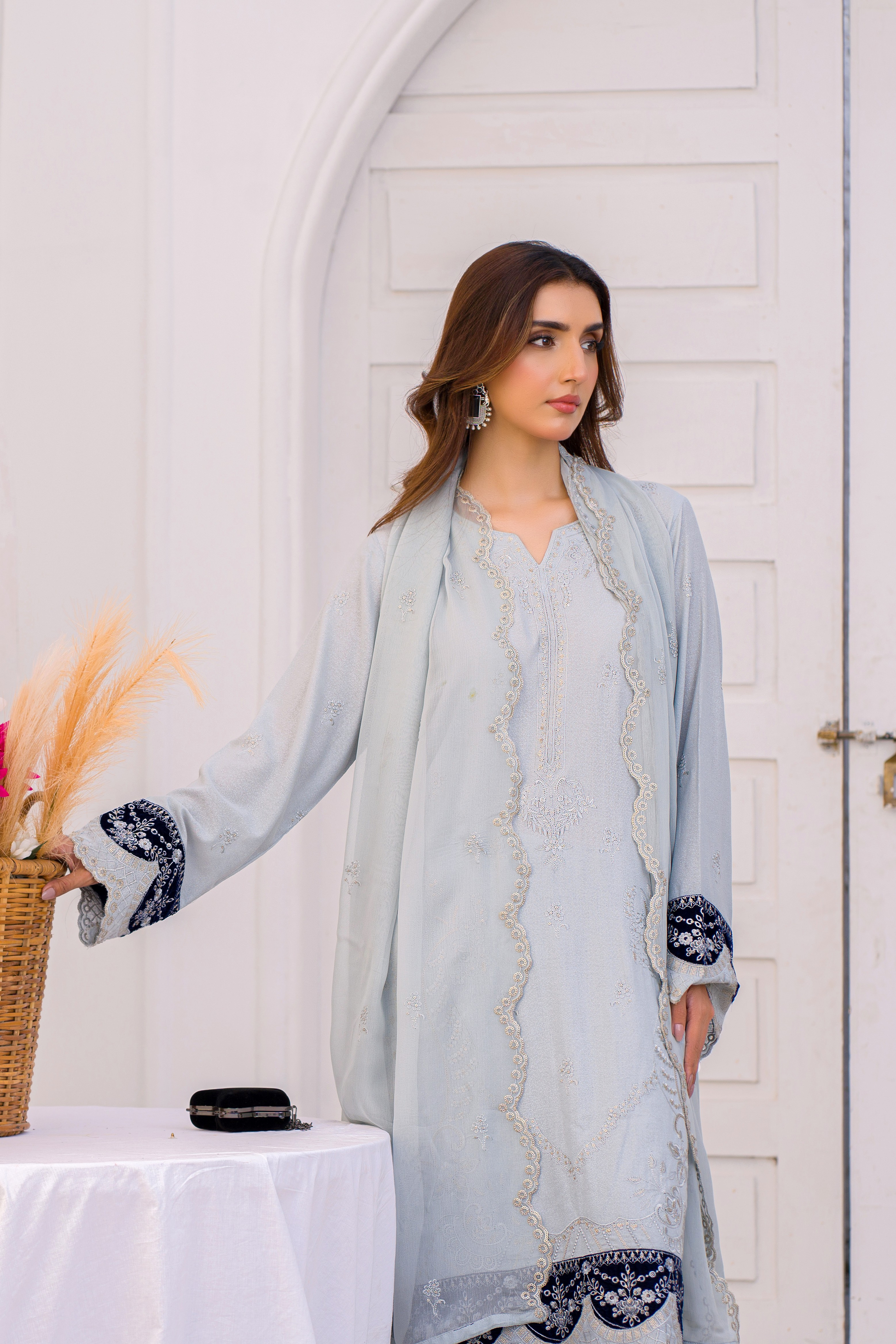 Unveil your soft, sophisticated side with this dreamy blush embroidered suit. The straight kurta is crafted from Karandi fabric and features delicate embroidery with velvet patch. her ensemble is perfectly matched with relaxed wide leg trouser in the same gentle hue, creating a harmonious and utterly refined traditional look with embroidery chiffon dupatta.