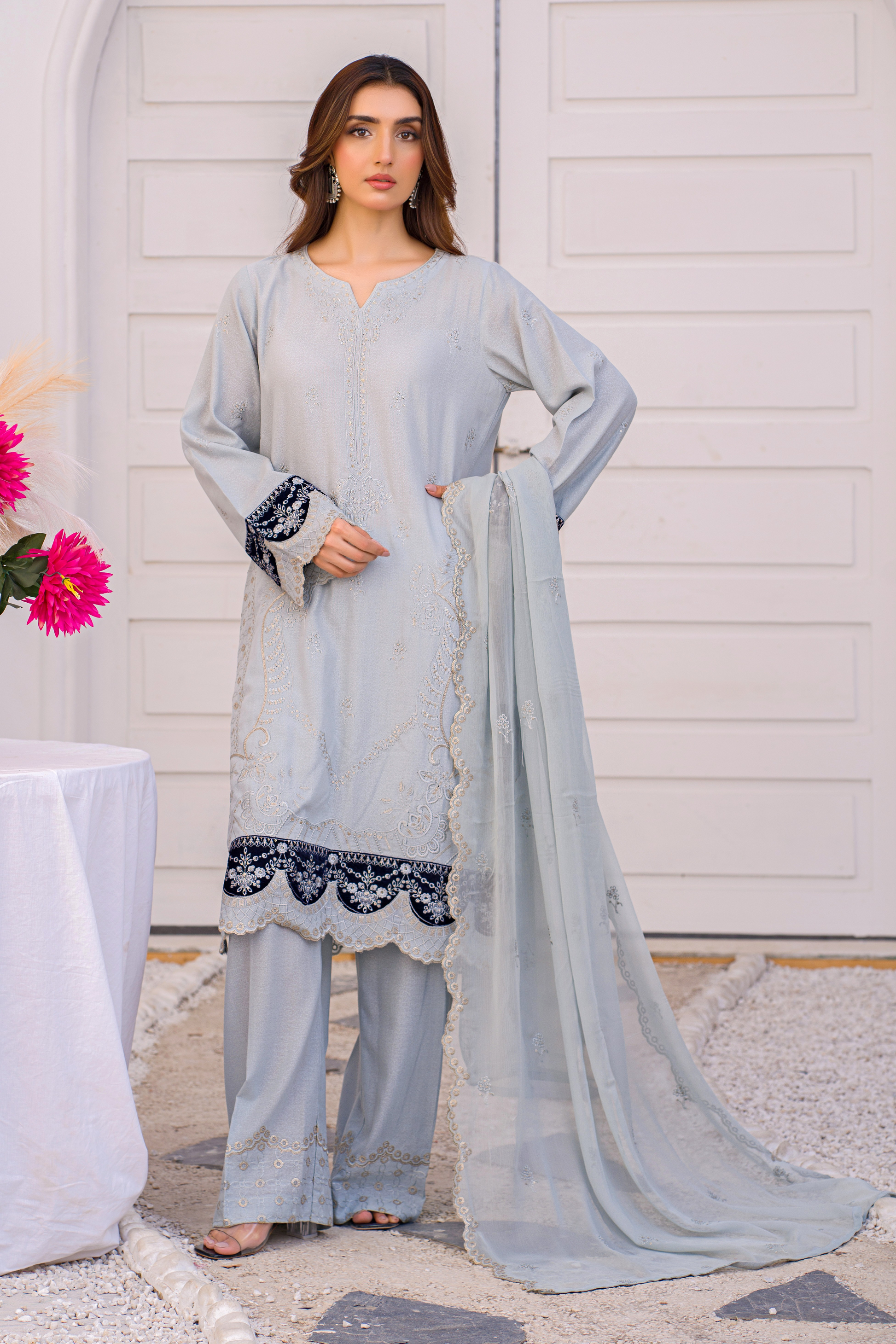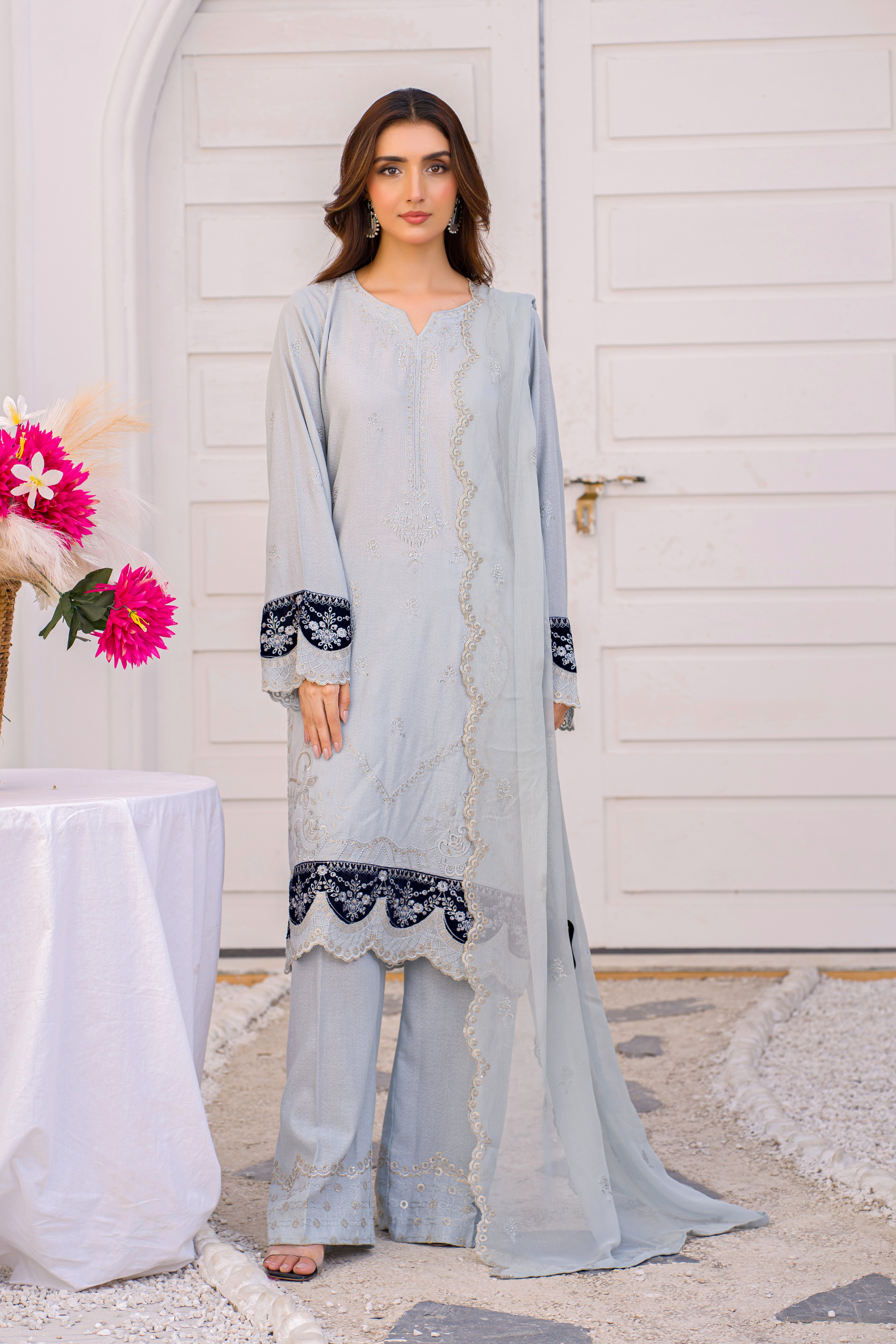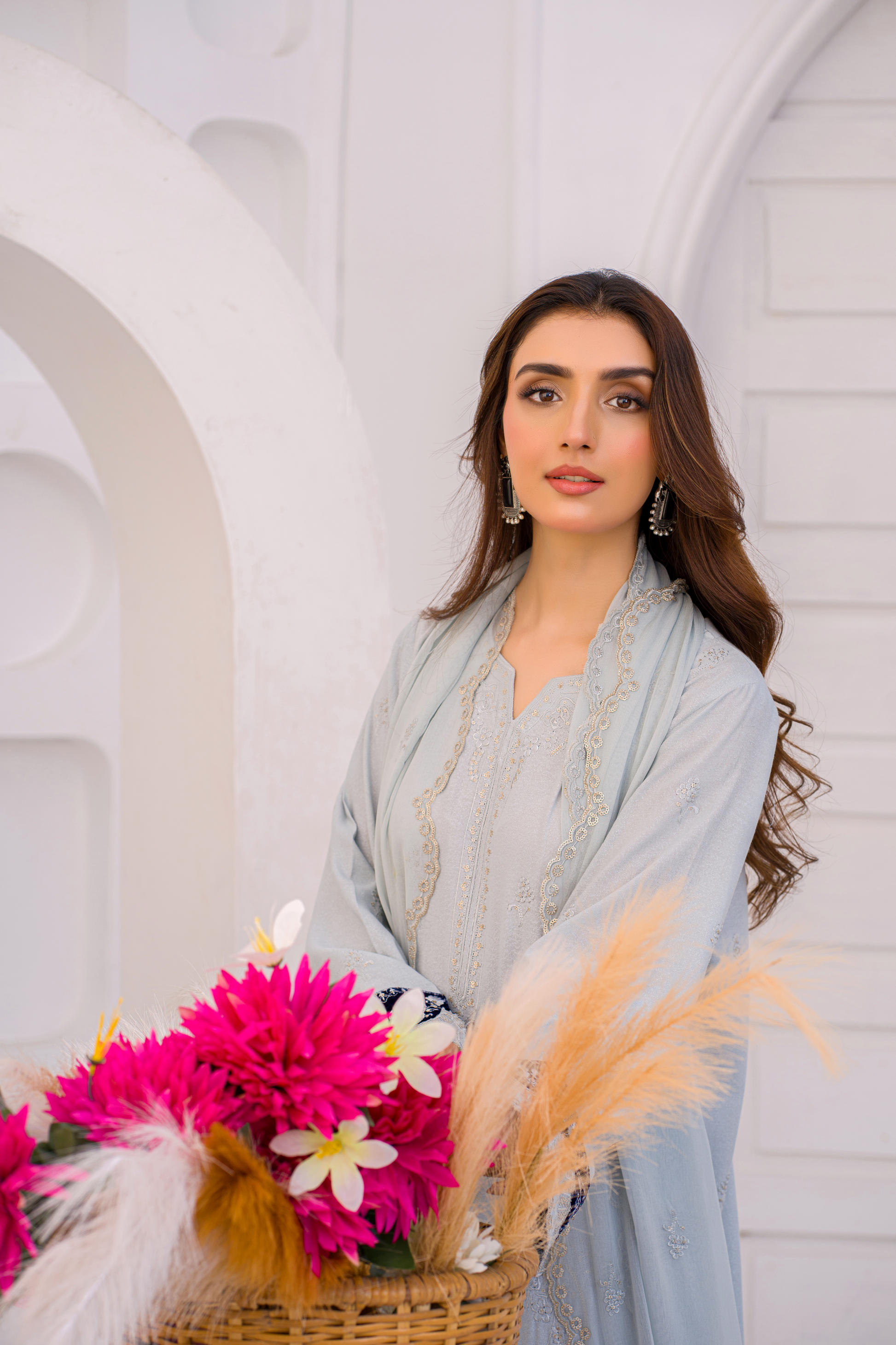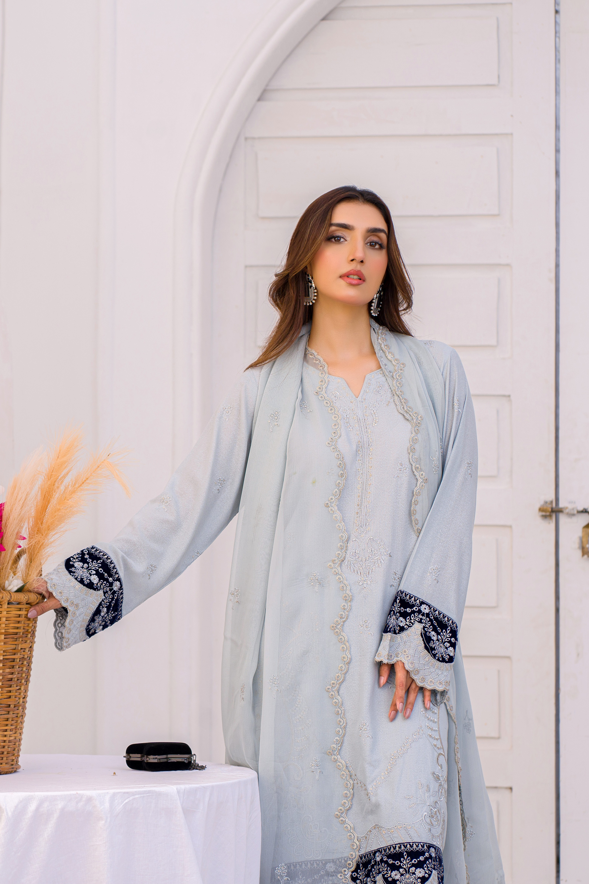 Unveil your soft, sophisticated side with this dreamy blush embroidered suit. The straight kurta is crafted from Karandi fabric and features delicate embroidery with velvet patch. her ensemble is perfectly matched with relaxed wide leg trouser in the same gentle hue, creating a harmonious and utterly refined traditional look with embroidery chiffon dupatta.