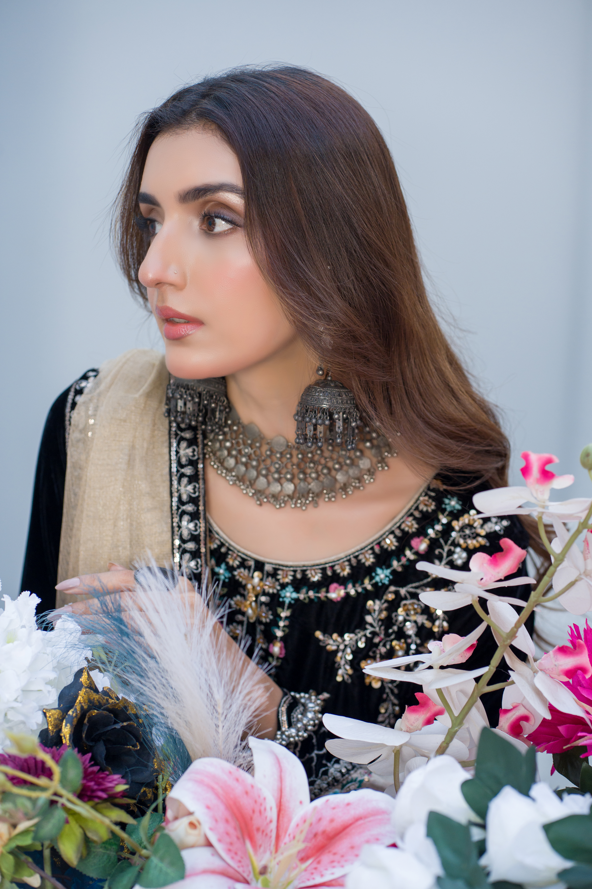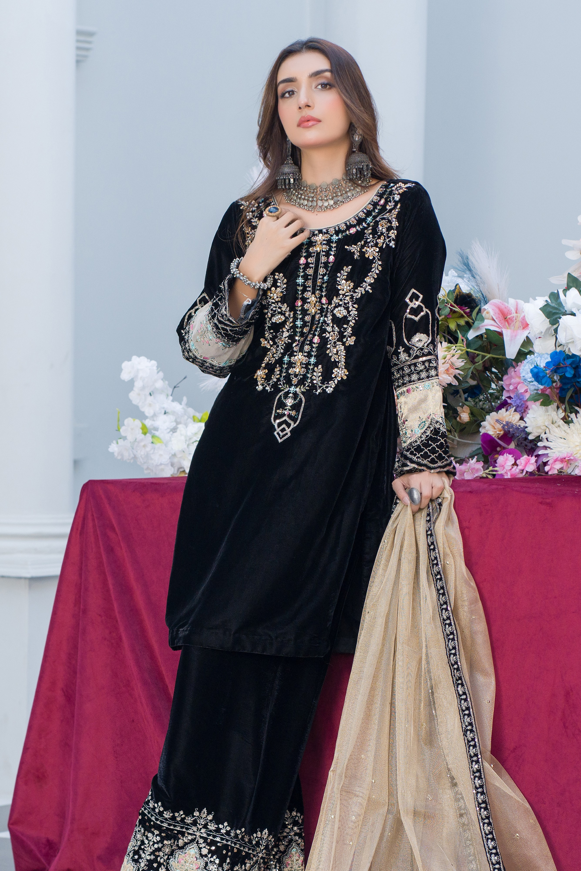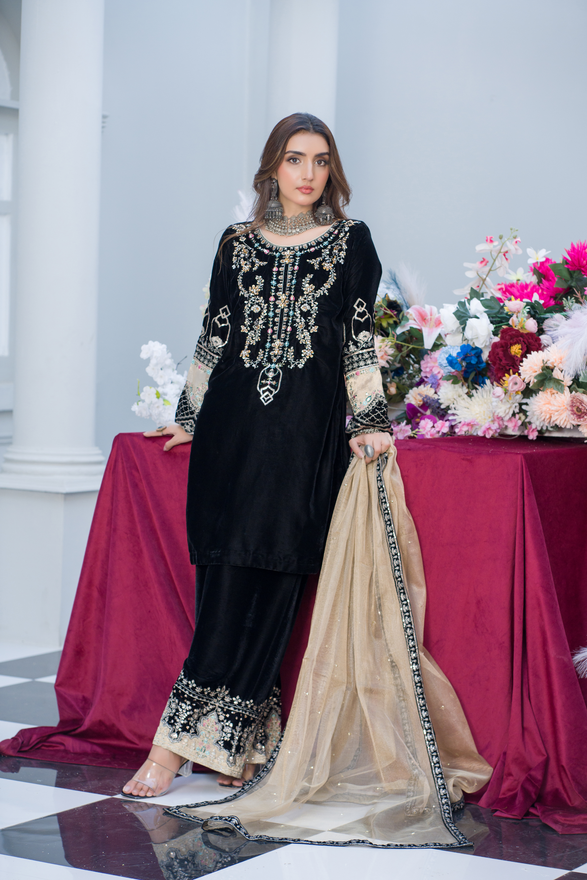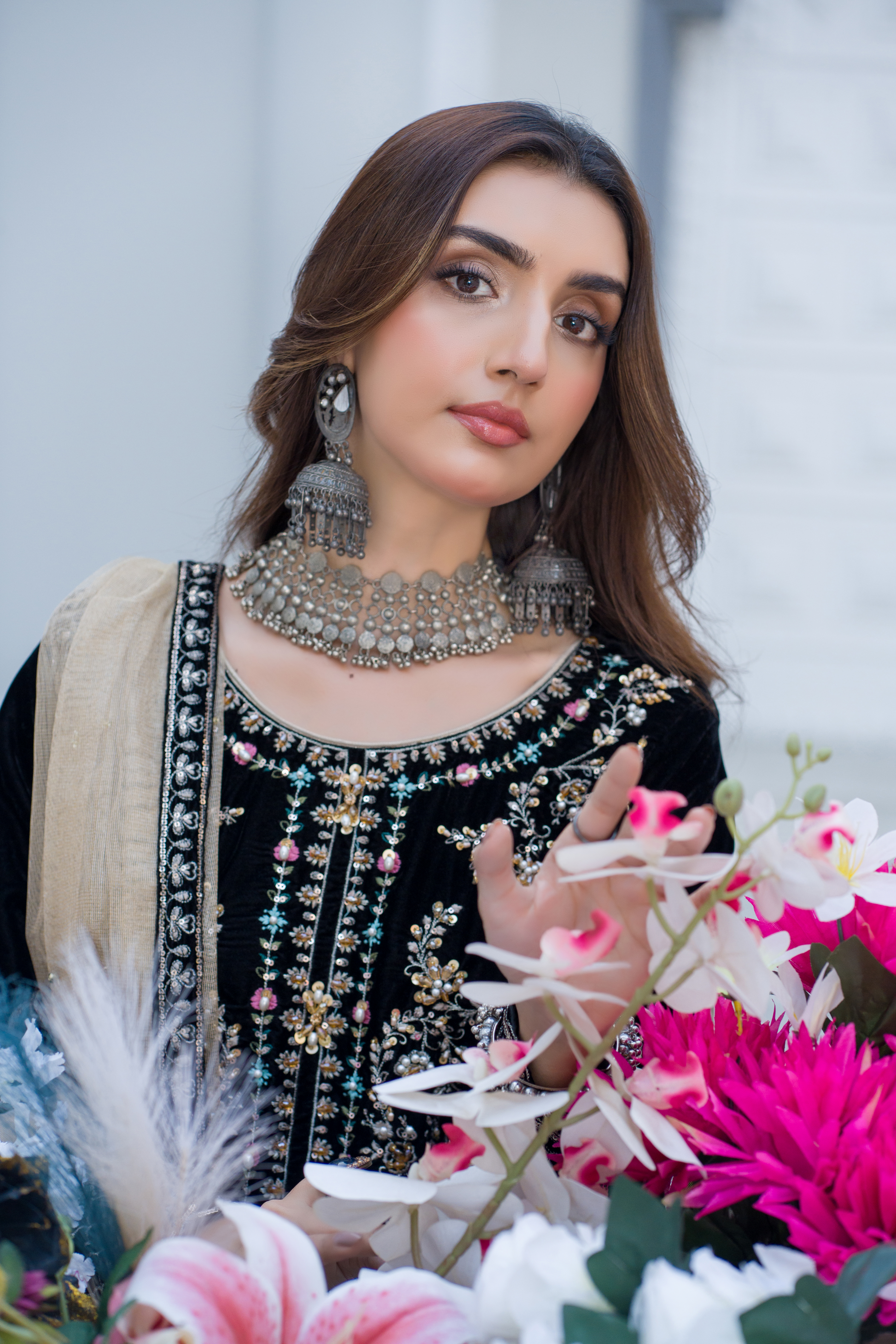 This luxurious embroidered velvet ensemble blends rich textures with delicate craftsmanship.